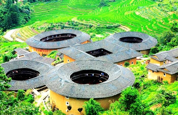 B:世泽楼-建于清代嘉庆年间。大门口地面有鹅卵石铺成的古代钱币模型,它象征着招财进宝之意。楼内一门、二井、三堂、四梯,设计合理,完全符合家族群居的特点。A:游览高贵典雅的土楼之王---承启楼据传从明崇祯年间破土奠基,至清康熙年间竣工,历世3代,阅时半个世纪,其规模巨大,造型造型奇特,古色古香,充满浓郁的乡土气息。全国重点文物保护单位。承启楼直径73米,走廊周长229.34米,全楼为三圈一中心。外圈4层,高16.4米,每层设72个房间;第二圈二层,每层设40个房间;第三圈为单层,设32个房间,中心为祖堂,全楼共有400个房间,3个大门,2口水井,整个建筑占地面积5376.17平方米。全楼住着60余户,400余人。由于承启楼规模宏大,造型奇特,1981年被收入《中华名胜词典》,同年被列入《世界建筑史》,还在台湾桃源“小人国”和广东深圳“锦绣中华”展示其模型。1986年,国家邮电部发行的一组中国民居系列邮票,其中福建土楼民居邮票就是以承启楼为图案的,该邮票在日本被评为当年最佳邮票。