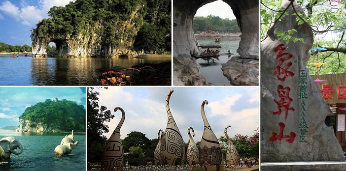 桂林象鼻山,象山以神奇著称。其神奇,首先是形神毕似,其次是在鼻腿之间造就一轮临水明月,构成“象山水月”奇景。因此,象鼻山是桂林的城徽山,是桂林旅游的标志山,它坐落在桂林市中心的漓江与桃花江汇流处,形似一头鼻子伸进漓江饮水的巨象,象鼻和象腿之间是面积约一百五十平米的圆洞,江水穿洞而过,如明月浮水。坐落西岸的象山水月与漓江东岸的穿月岩相对,一挂于天,一浮于水,形成“漓江双月”的奇特景观,2017年春晚最佳灯光舞台。