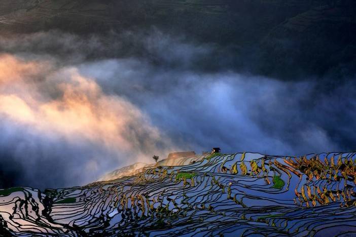 从观测梯田的景观台从上往下望去是一幅幅绚丽壮观的景象。这一景象是众多摄影爱好者梦想的画面。