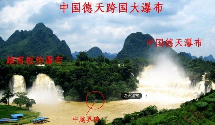 德天瀑布位于大新县归春河上游,距中越边境53号界碑约50米。清澈的归春河是左江的支流,也是中越边境的国界河,德天瀑布则是它流经浦汤岛时的杰作。浩浩荡荡的归春河水,从北面奔涌而来,高崖三叠的浦汤岛,巍然耸峙,横阻江流,江水从高达50余米的山崖上跌宕而下,撞在坚石上,水花四溅,水雾迷朦,远望似缟绢垂天,近观如飞珠溅玉,透过阳光的折射,五彩缤纷,那哗哗的水声,振荡河谷,气势十分雄壮。它与越南的板约瀑布连为一体,就像一对亲密的姐妹。中越边民在瀑布的下游,进行着边贸往来,曾经是肩挑人扛。