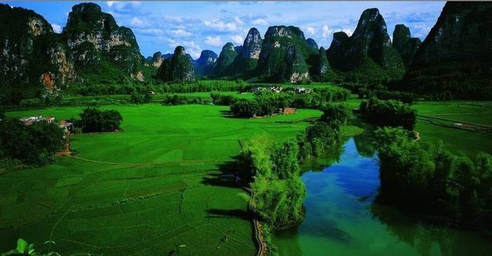 明仕田园风光水秀,山环水绕,素有小桂林之称。这里翠竹绕岸,农舍点缀,独木桥横,稻穗摇曳,农夫荷锄,牧童戏水,风光俊朗清逸,极富南国田园气息。