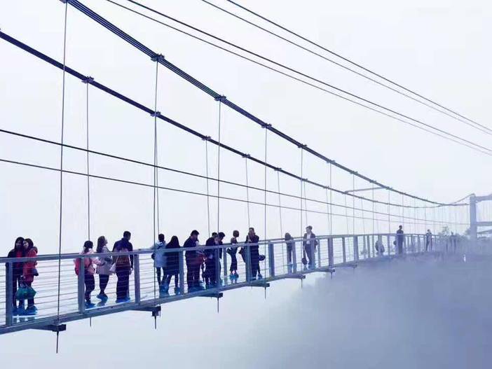 桥面铺设钢化防滑玻璃,为3层夹胶玻璃,尺寸305cm×2210cm,共需要99块,厚度4.856厘米。按照设计的桥面最大游客容量500人算,其重量完全可以忽略不计。【惊魂玻璃桥】+【飞龙滑道】【需自费60元/人】(因为每个人的身体素质不同所以费用没有含在行程里,胆大的可以自费体验)