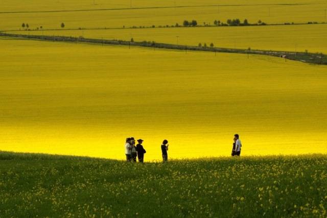 黄色的油菜花田和绿油油的青稞麦田交错成块,整齐的在天空之下漫漫舒展。