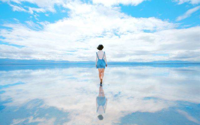 云朵铺满天空,映在茶卡盐湖,影影绰绰。美丽的女孩身着一袭白裙,仿佛置身云端。
