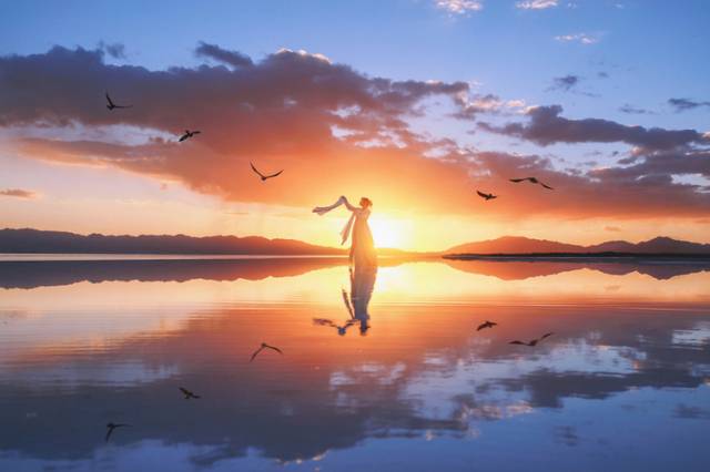 今天早起,我们前往【茶卡盐湖】拍摄日出。这里盐湖水域宽广,银波粼粼,蓝天白云悠悠,远处高山屹立,如诗如画,相比较茶卡盐湖日落而言,茶卡盐湖的日出更适合拍摄人像,顺光比较清晰,能够更好反映人物形态。当湖面上空出现了绚烂的朝霞,水鸟在湖上游弋,太阳裹着镶着金边的云彩缓缓地从湖面升起,随后倏地跳到湖面之上,湖面霎时间金色闪烁。这就是属于你的大片时刻。