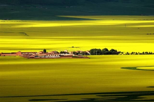 黄色的油菜花田和绿油油的青稞麦田交错成块,整齐的在天空之下漫漫舒展。