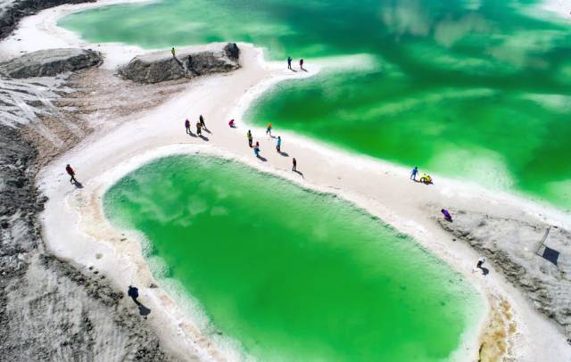 早起用餐后,驱车前往【翡翠湖】。这是一处尚未开发的小众景点,因湖水颜色翡翠般美丽,故得名翡翠湖。翡翠湖原是大柴旦化工厂盐湖采矿队的采矿区,是历经多年的盐湖开采之后形成的采坑,由于所含矿物质浓度不同,也就形成了颜色多彩的景象,特别是风平浪静的时刻,宛若镜面般的散布在四处,倒影着蓝天白云,柴达木山的皑皑雪峰,身处其间,看着身影在脚下,此刻的感受,也只有身临其境才能深刻感受。