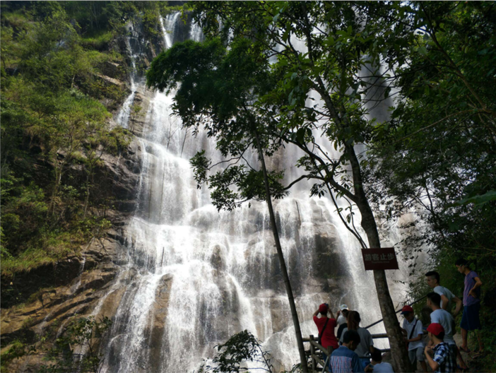 2 .竹海瀑布:两旁为竹海,高约7-10米,甚是幽静。水流湍急而成银白色,下为深约两米有余的水潭,在此游泳、拍照留念甚好。穿过溪头村的双水潭进去,大概走十来分钟就能发现竹海瀑布。