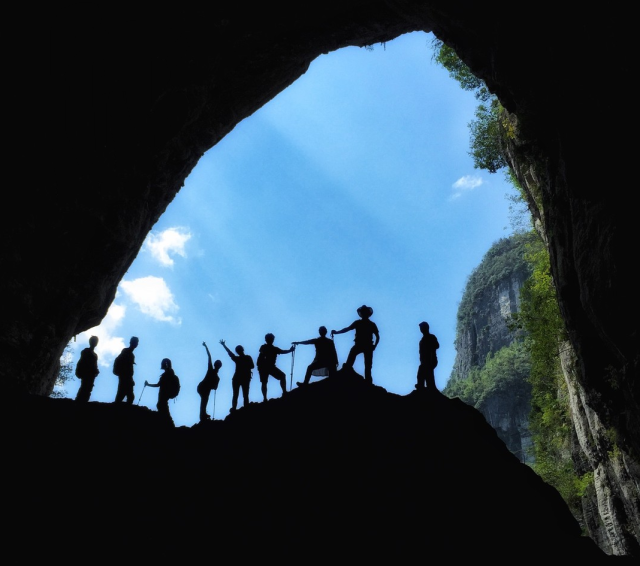 一路前行进入峡谷底部,首先映入眼帘的便是巨大洞穴--白洞,好奇的大家可前往一探究竟;接着便来到本日徒步精华--古河床巨石阵,行走于巨石上,脚踩亿年前的巨石褶皱,大叹大自然的神奇呀!再接连穿过三洞连两天坑的奇妙地貌景观,感受水的强大魅力;最后手持提前准备好的照明设备穿过大龙门,过一场火车过山洞的瘾~之后映入眼帘的便是电影《聂隐娘》取景点之一--峡谷草坪,农家散养的牛与绿绿葱葱的草坪相得益彰,天时地利人和,岂能少得了咱们的大合影!预备!走位!造型拗起来!