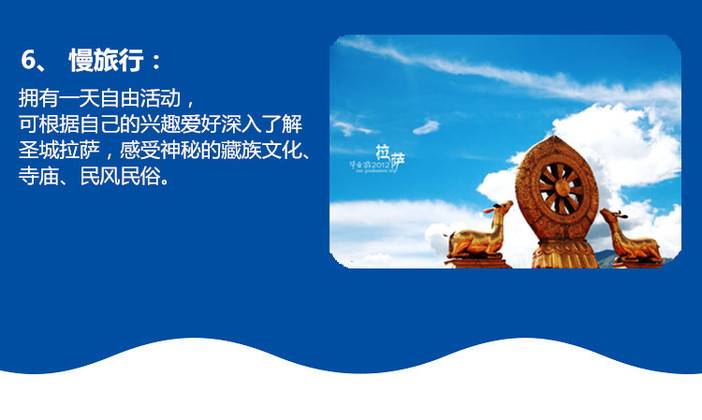 11、西藏春夏季多雨,经常造成泥石流及塌方,由于以上原因及其他人力不抗拒原因而造成团队不能按照行程前往拉萨以外地区旅游,接待方不承担任何赔偿责任,客人所交团费不退还也不增加,我司会在拉萨地区增加景点用以弥补。