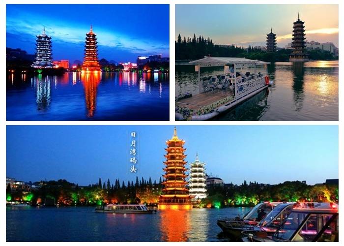 桂林上月双塔号称世界第一铜塔,是桂林旅游的一个绝美的夜景观赏地。