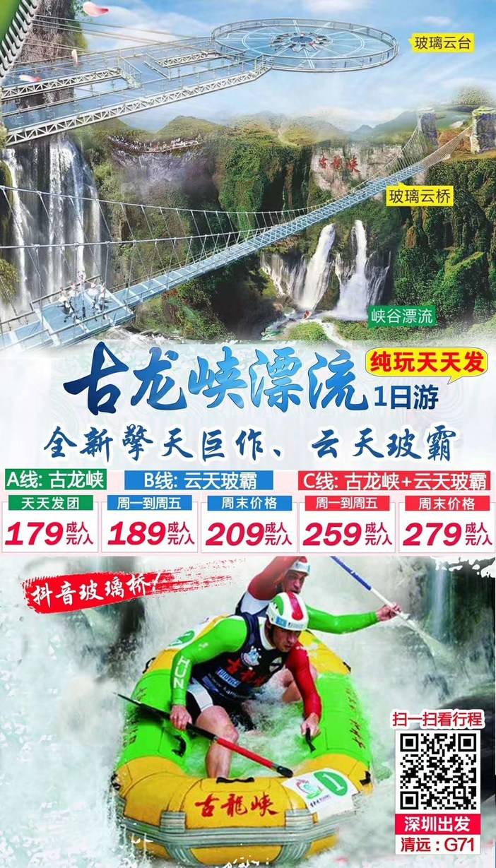 C线:出发—午餐—古龙峡全程漂+玻璃大峡谷云天波霸—回程