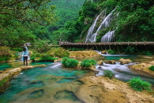 被融于小七孔的峰林、湖泊、瀑布与水溪中