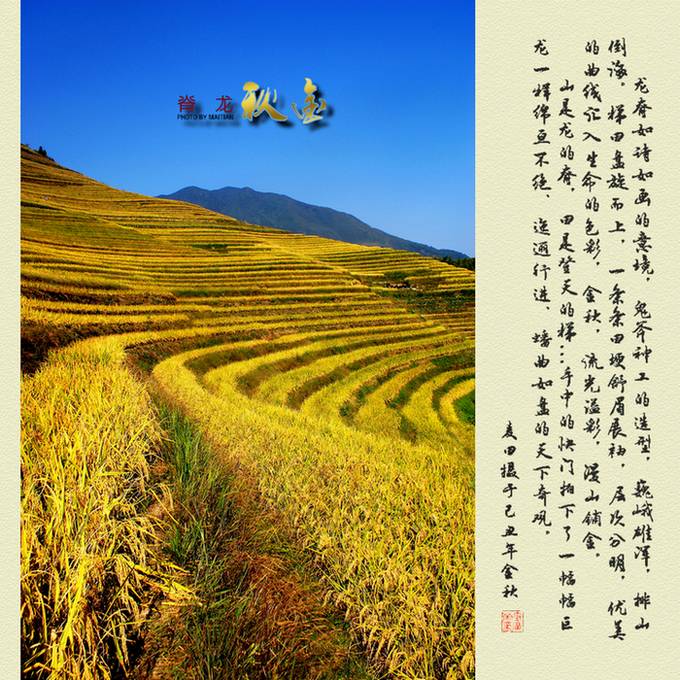 金色的秋天,阳光艳照,把龙脊层层梯田上的稻谷醉熟了,满山是金黄色的稻穗,稻谷随风摇曳,远远望去,龙脊的山都充满动感,像巨龙一样穿云破雾气呑山河,龙脊金秋美景吸引着来自全世界各地的游客。