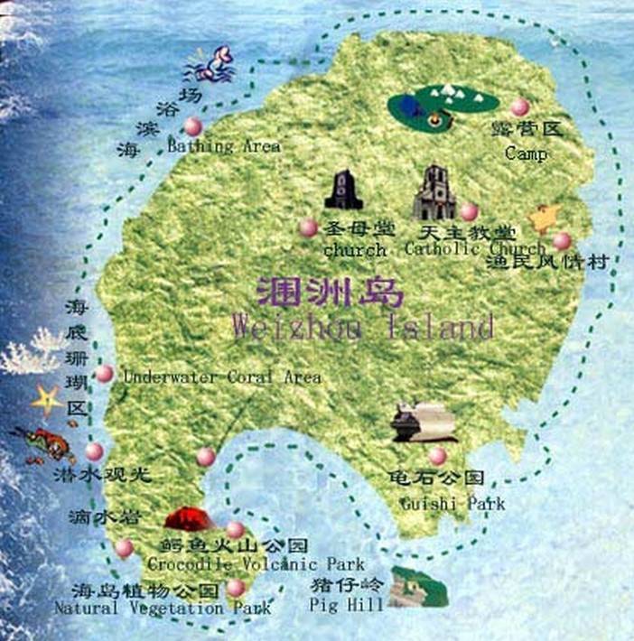 涠洲岛是广西最大的海岛,也是我国最大的死火山岛。岛上景观资源丰富,有火山熔岩景观——鳄鱼山景区;介绍火山演变形成的涠洲岛国家地质博物馆;朱帘长挂的滴水丹屏;还有许多形似海豹海豚、海马海星的礁石岩洞,如仙人洞等;另有位于盛堂村的天主教堂,还有印证着中西合璧的历史足迹三婆庙及圣母庙。此外,涠洲岛还是潜水探奇的极好去处,在涠洲岛往斜阳岛一路的海水底下,还能见到奇特而美丽的海底彩带。对于吃货而言。来涠洲岛最大的乐趣可能不是以上的景点。而是价廉味美的海鲜吧,南湾街是这里的农贸中心,可在这采购海鲜,带回去找店家加工,同时南湾街也是酒吧集中的地方。另外天主教堂外有小集市,不少村民在此摆摊买些当地特色小吃,如凉粉、糍粑、红薯糕等,还有馒头,一般1-2元/份,很便宜。游涠洲岛最好是停留一个晚上,领略夕阳西下及太阳初升的神韵,日落在滴水丹屏到石螺口一线观看,日出在五彩滩到天主教堂以外的东线观看。