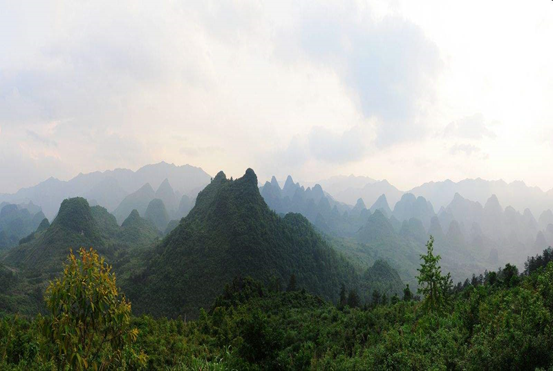 瑶寨的对面,是一个大山谷,谷中群峰突兀,百峰争雄,仿如千军万马,汹涌而来。伫立于此,感觉有如君临帅台,点兵阅将,故此景得名“万山朝王”,非常贴切。