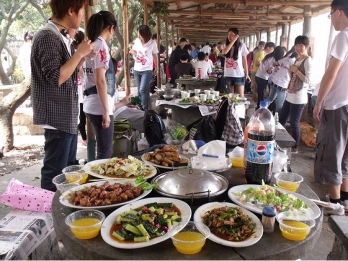 11:40来到【野炊园】进行我们的野炊。分队。农家乐的过程是:分10人一组,选队长,队长安排组员分别去领锅具和食材、捡柴、抓鸡抓鱼、菜地摘菜,开始做饭。