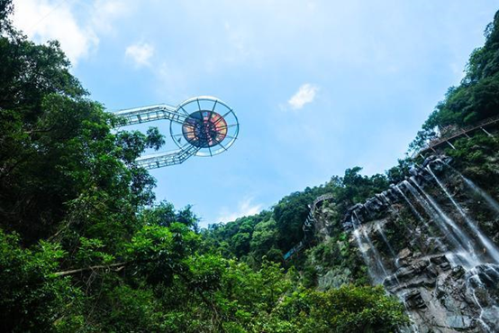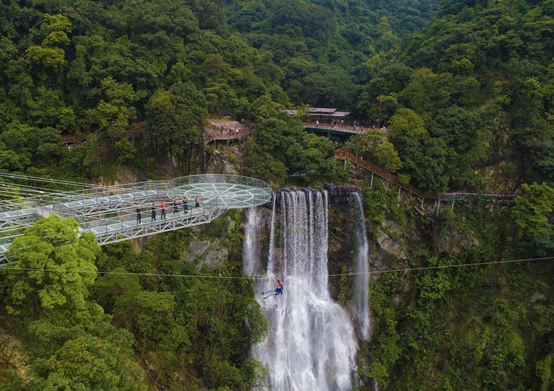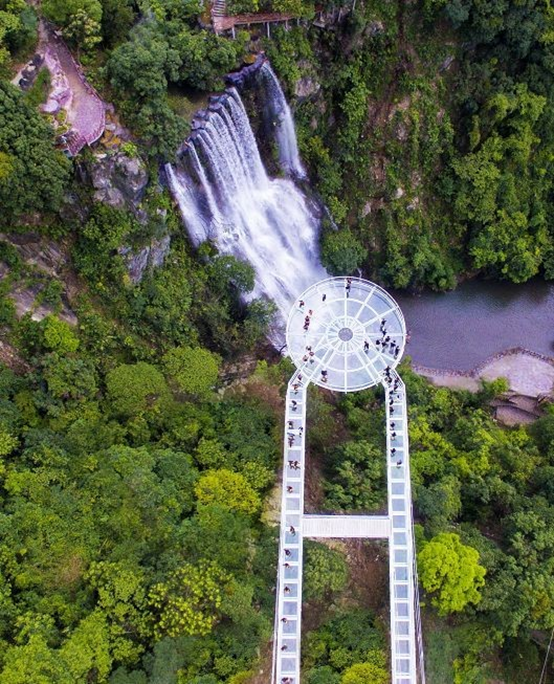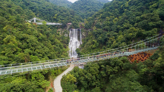 玻璃峡谷位于万丈崖大瀑布的顶端,目之所及,悬崖峭壁、飞瀑擎天。玻璃峡谷采用3层1.5厘米的超级透明玻璃,是目前世界上最厚的栈道玻璃,超白玻璃透光率99.15%