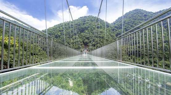 玻璃桥:全长329米,平均宽度3.8米,最宽处6.8米(张家界玻璃桥宽度6米)。桥上2个港湾式透明观景台就位于最宽处。