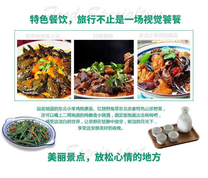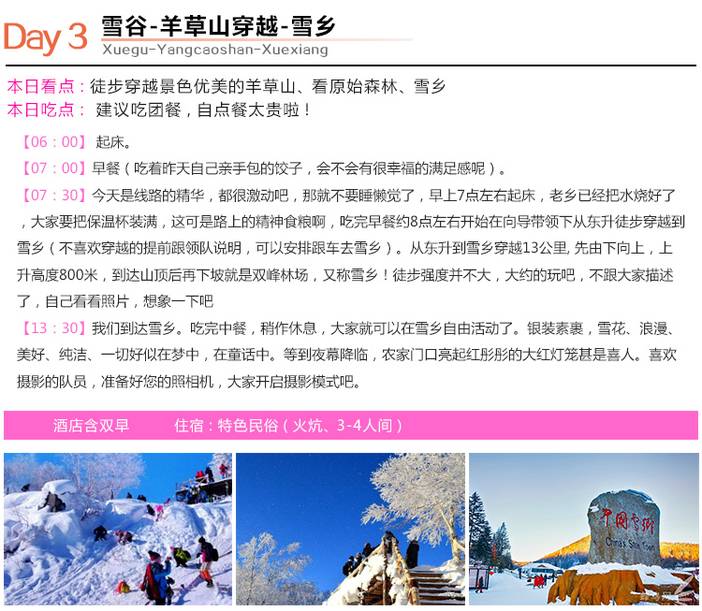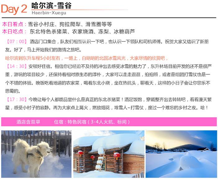 雪谷晚餐(东北杀猪菜)、二人转、篝火、旅行三宝、纪念章、雪仗/雪套(免费使用,损坏赔偿) |