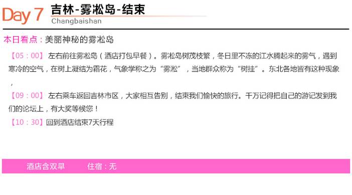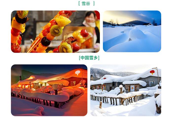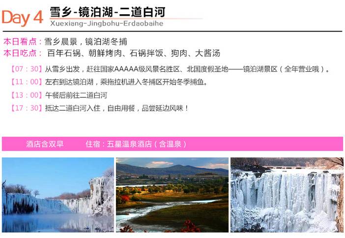 雪谷、雪乡、镜泊湖、长白山、雾凇岛 |