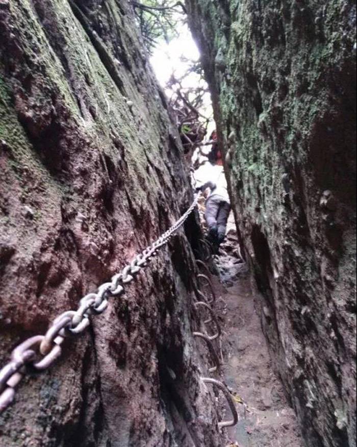 马鞍山还有“一线天”:在两块岩石之间有一裂缝,从中望天,只能看到一线的天空。石缝最窄处人都不能站立,置身其中,吹来的山风让“一线天”宛如空调房。马鞍山被越来越多知晓,到了周末可看到很多拿着相机登山的游客。
