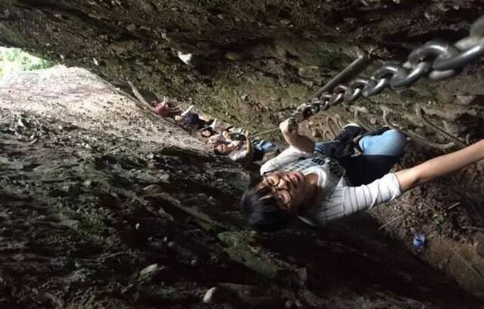 马鞍山上植被保护得很好,有许多山藤,分不清是藤缠树还是树缠藤,藤与树形成的“秋千”随处可见。马鞍山的植物特别之处在于岩石上的树木根系特别发达,根系爬过岩石伸到岩石下的泥土里吸收养分。在布满树根的岩石边拍上一张照片,倒是个很不错的选择。