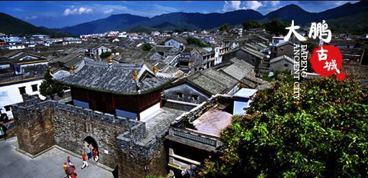 大鹏古城(又称大鹏所城)位于深圳市东部大鹏镇鹏城村,始建于公元1394年,为广州左卫千户张斌开所筑。是明代为了抗击倭寇而设立的“大鹏守御千户所城”,简称“大鹏所城”。走进大鹏古城,可以看到保存完好的明清时期的民居和宅地,那狭窄蜿蜓的小巷以青石板铺就,宁静古朴;数座建筑宏伟、独具特色的清代“将军第”有序分布。其中以抗英名将赖恩爵的振威将军第最为壮观,该将军第有150年的历史,拥有数十栋屋宇、厅、房、井、廊、院等,其中牌匾众多雕梁画柱,是广东省不可多得的大型古建筑