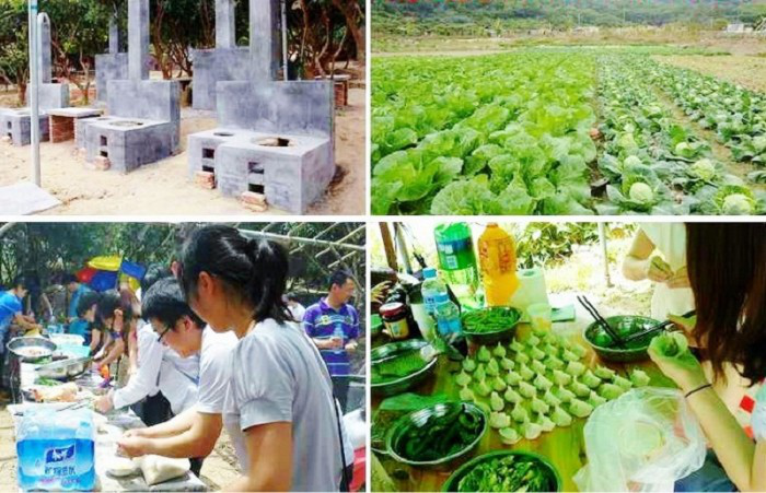 11:00组长带领队员领 取食材、抓鸡、杀鱼等。看看你和他的默契, 女摘菜来,男抓鸡,一起动手生火,做饭等,俗语云:男女搭配干活不累 ! 一顿香喷喷的饭菜就在轻松惬意的氛围里上桌,赶紧开动,畅享自己创造的美味大餐吧。