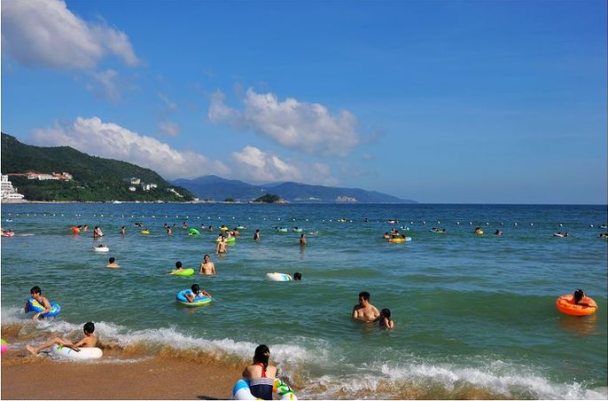 这里背依温柔环抱的群山,有绵延四公里沙质,柔软的沙滩,最为洁净清澈的海水,沙滩生有万种风情的松林。山光水色、金沙夕照、林涛海韵、潜水征帆构成了一幅风光旖旎、风景迷人的海滨图画。