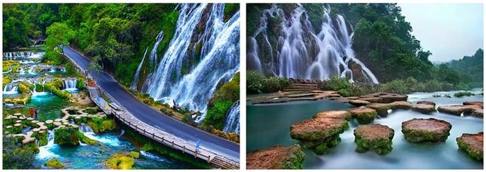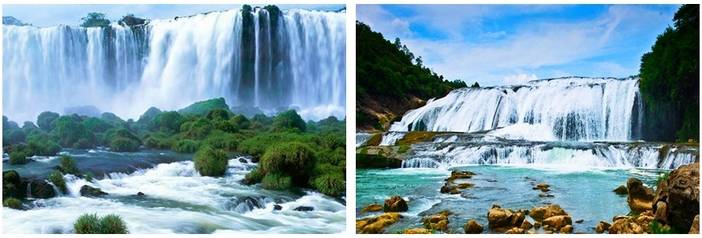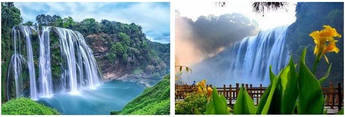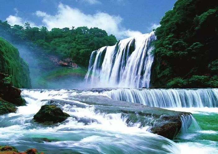 黄果树瀑布:吉尼斯世界上最大的瀑布群,在三百多年前,旅行家徐霞客描述其“水由溪上石,如烟雾腾空,势其雄厉,所谓珠帘钩不卷,匹练挂遥峰,具不足拟其状也”。奔腾的河水自70多米高的悬崖绝壁上飞流直泻犀牛潭,发出震天巨响。水帘洞位于大瀑布四十米高度上,全长一百三十四米。在水帘洞,经常观赏到犀牛潭上的彩虹"。