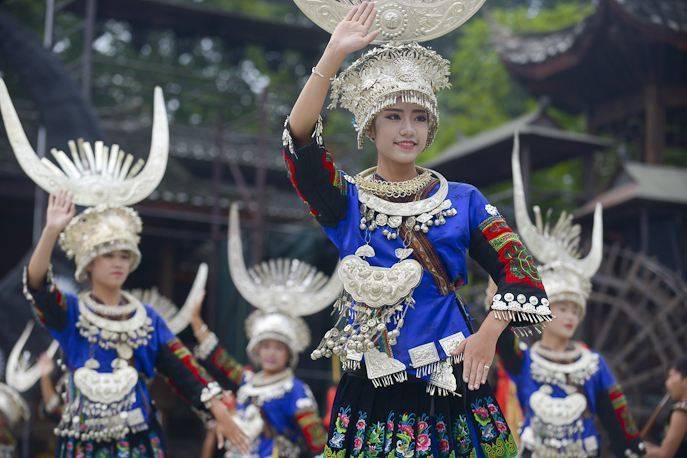 西江千户苗寨:苗疆绵延千里,村寨难计其数,但没有任何一个寨子,敢于挑战西江寨所独有的骄傲头衔——“千户苗寨”,也是中国最大的苗寨。寨子座落河谷,四面群山环抱,重峦叠嶂。源于雷公坪的白水河,蜿蜒流淌,穿寨而过。房前屋后,翠竹点缀,寨脚寨顶,枫叶掩映。在苗寨可以享用苗家风味特色晚餐,席间接受苗家少女飞歌敬酒,在苗家吊角楼美人靠(凉台栏杆,苗家称为"美人靠")上观千户苗寨万家灯火。观赏铜鼓芦笙表演,晚上可宿苗家吊脚楼。