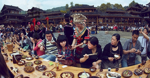 舌尖上的中国:苗家特色长桌宴---苗家稻花鱼鱼酱火锅、苗家特色长桌宴,苗家特色菜肴有:酸汤鱼、苗王鱼、鸡稀饭、山野菜等。老凯里酸汤鱼、金顶山清水汤、龙大哥辣子鸡、新大新豆米火锅、丝娃娃、肠旺面、花溪牛肉粉、酸汤雷家豆腐圆子,猪蹄火锅、刘二妈米皮等等。