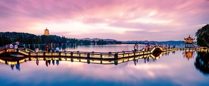 【杭州西湖】中国十大风景名胜,《世界遗产名录》中国文化遗产。西湖三面环山,夕照山的雷峰塔与宝石山的保俶塔隔湖相映,由此形成了“一山、二塔、三岛、三堤、五湖”的基本格局。西湖,人类与自然和谐相处的产物,无法复制。春来“花满苏堤柳满烟”,夏有“红衣绿扇映清波”,秋是“一色湖光万顷秋”,冬则“白堤一痕青花墨”。名中有诗,名中有画,以命名艺术之美点化自然山水。
