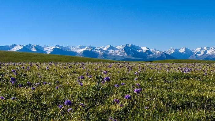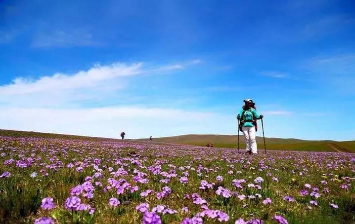你一定很少构筑过这样的草原图景 —— 曲线流畅的人体草原五颜六色,远处白色的雪峰被阳光映照得熠熠生辉,冰雪覆盖的古冰斗群依稀可辨,蔚蓝色天空下林线如带,百花吐艳,你发现自己正置身于一个多彩而立体的“空中花园”。
