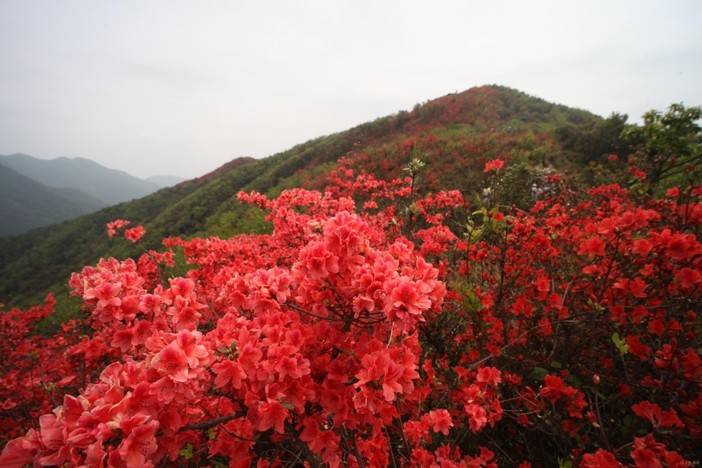 杜鹃花花瓣密密匝匝,蕊靠着蕊,瓣贴着瓣,一簇簇、一团团、一片片、一层层,怒放枝头,缀满枝条,铺满山坡。春风吹过,红浪荡着绿波,一浪高过一浪,美不胜收。
