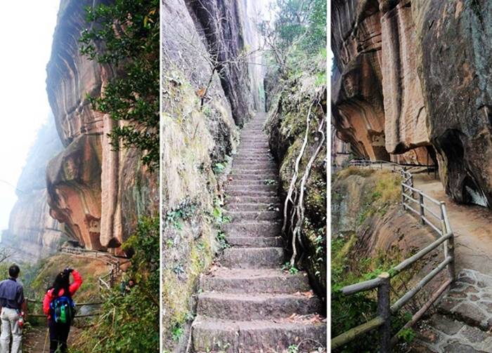 暧坑至巴寨的海拨上升度为450米左右,前半段是丛林,穿越过树林便可见到神秘的巴寨主峰,解放前的巴寨地势险要,用“一夫当关,万夫莫开”来形容再贴切不过了,上巴寨只有一条80度倾斜人工凿的石梯,主峰有石缝里流出来的天然泉水,只要粮食充足,守个一年半载也不成问题,今儿我们沿着修好的路,经过一线天,到达第一层土匪窝,土匪粮仓,土匪下棋台,第二层土匪窝有山泉水可接,大家一定要尝试一下,非常甘甜可口(肠胃不好的就要注意了。)