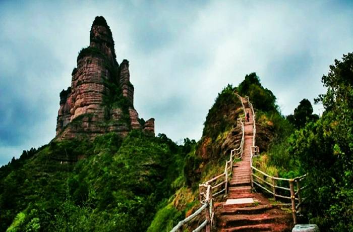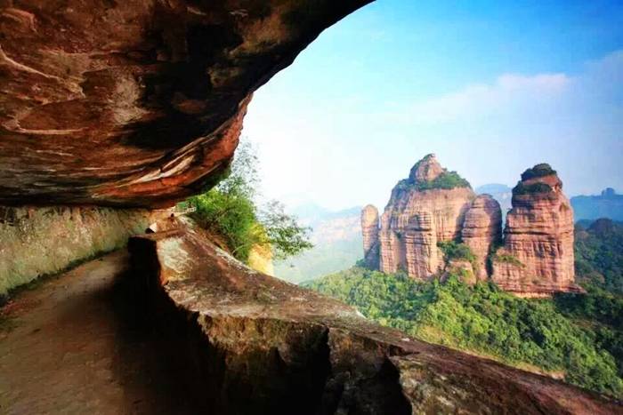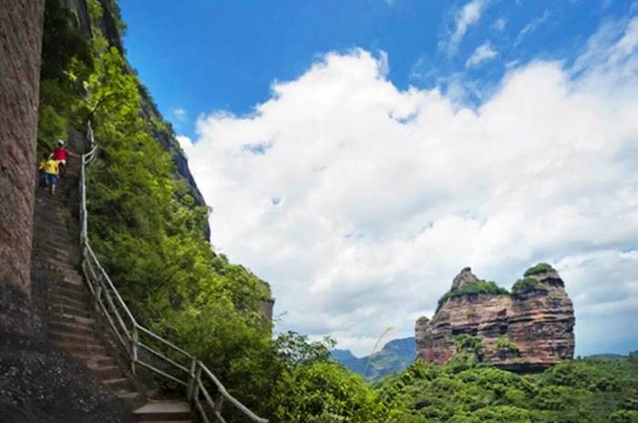 被“中国国家地理杂志-选美中国特辑”收录在中国最美丽的七个丹霞地貌之首。狭义的丹霞山仅限于北部的长老峰、海螺峰和宝珠峰构成的山块,以宝珠峰最高,海拨409米。广义的丹霞山却包括了这里由红石组成的280平方公里的丹霞山区,即丹霞山风景名胜区。风景区位于南岭山脉南侧的一个山间盆地中,整体呈现一种红层峰林式结构,有大小石峰、石堡、石墙、石柱、石桥680多座,主峰巴寨海拔618米。大多山峰在300-500米之间。整个风景区山石林立,错落有致,形象万千,宛如一方红宝石雕塑园,故又称“中国红石公园”。徒步在风光美丽的丹霞峰林,丹崖赤壁。沿着历史栖息过的崎岖山路,仿佛回到了古代:驿站、山寨、古石级。吸引着我们踏上先民通往北方,曾经繁华的古道。