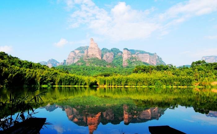 丹霞山之秀,主要秀在锦江。一江碧绿的玉液,出自万顷林海,在丹霞山群中迂回南流。锦江两边,翠竹夹岸,树木婆娑;近石倒映,远山逶迤,富有岭南风情的山村田园风光掩映其间。
