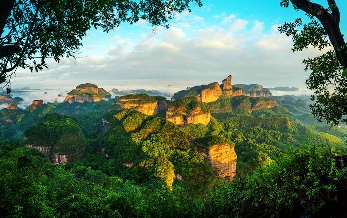 ▲结构美:丹霞山表现为峰林结构,其山石高下参差、疏密相生,群峰林立,组合有序,富有韵律感和层次感。尤其是在晨昏霞光背景下,山群更富有结构美感。