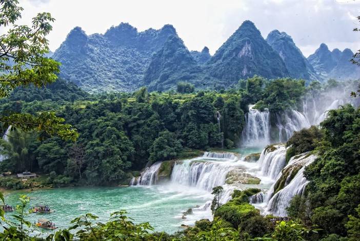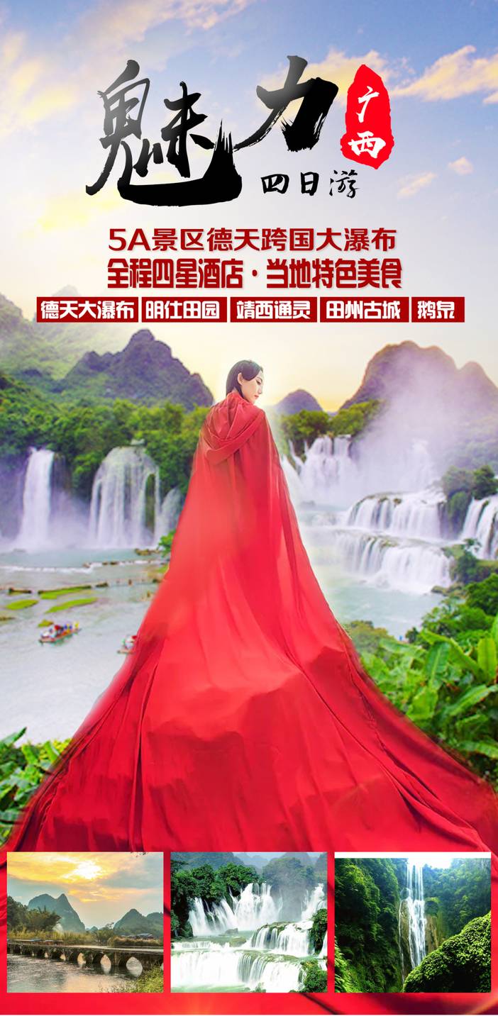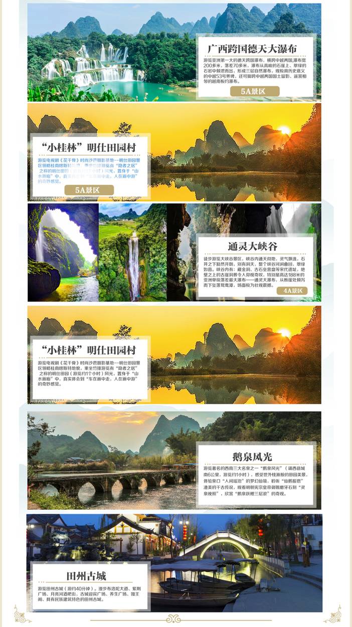 早餐后,酒店集中乘车前往电视剧《花千骨》时尚沙芭摄影基地--明仕田园景区(车程约约1.5小时)。游客可漫步明仕田园村,领略桂南喀斯特地貌 。乘坐竹排游览有“隐者之居” 之称的明仕田园(游览约1个小时)风光,置身于“山水画廊”中,你能真实体会到“车在画中走,人在画中游”的奇妙感觉。中餐后前往德天瀑布(车程约50分钟),游览【德天瀑布】景区(徒步游览约2-2.5小时),堪称亚洲第一大的德天跨国瀑布,横跨中越两国,瀑布宽200多米,落差70多米,瀑布从高峻的石崖上、翠绿的石岩中倾泄而出,形成三层自然瀑布,遥望似素缟垂天, 近观则白雾升腾、飞珠溅玉,气势磅礴,观极具历史意义的中越53号界碑(中越边境矛盾时不开放),还可脚跨中越两国国土留影、遥赏相邻的越南板约瀑布。品尝当地越式特色“簸箕宴”。住酒店。