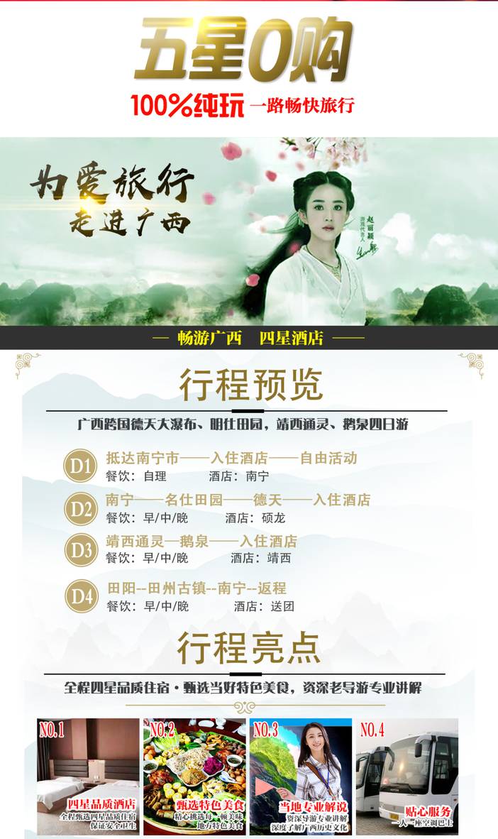 德天:德天大瀑布酒店、大阳谷山庄、硕龙山庄、或靖西县同等标准酒店;