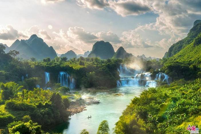 归春河静静地流向越南,又绕回广西,最终在硕龙这个边陲小镇,寂静了许久后的力量瞬间爆发,冲破了千岩万壑,冲出高崖绿树的封锁,一泻千里,划开了中越两国边界。也许是大自然的造化,倔犟垂坠的河水从高达60余米的山崖上跌宕而下,撞击着层层岩石,飞流曲折,水花四溅,水雾迷朦,远望似缟绢垂天,近观如飞珠溅玉,透过阳光的折射,五彩缤纷,那哗哗的水声,振荡河谷,在不经意间就形成了又一个迷人的奇迹:世界第四、亚洲第一大跨国瀑布——德天瀑布。于是,德天瀑布从被造就的那一天起,便成就了归春河最激情的表达。