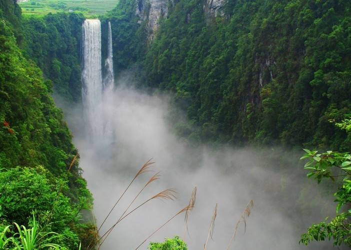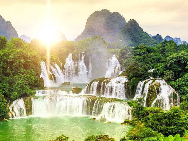 德天瀑布与越南的板约瀑布连为一体,就像一对亲密的姐妹,袅袅婷婷,携手而立。目光穿透那飘渺的水雾,恍见伊人,在水一方,腰缠春江如玉带,垂首秀发落巢湖,身倚峥嵘奇峰怪石,背靠满山梯田古木,巧笑盼兮,眉目传情。这实在是一个如诗般浪漫清雅的所在,步步是景,处处含情。人在其中,若画中游,心无旁骛,更无纤尘。只愿寻一处绿草茵茵,碧流潺潺之所在,盖一间茅草屋,栽几株桃树,耕几亩田,看那花盛枝头灼灼之时,效仿当年唐才子的风雅,执子之手,结下酒盏花枝隐士缘。