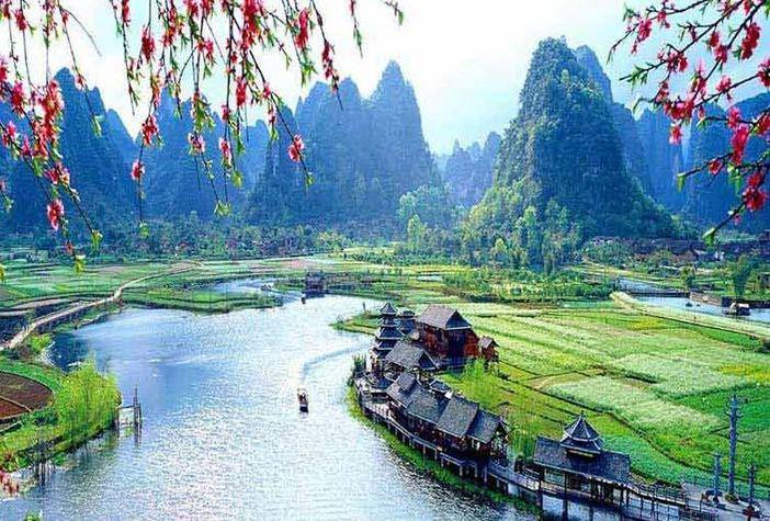 前往游览被誉为桂林的香格里拉【世外桃源】(游览不少于60分钟),源自陶渊明笔下《桃花源记》,李冰冰、任泉主演的《康美之恋》MV外景主要取景地,为世人展示了一幅古桥、流水、田园、老村与水上民族村寨融为一体的绝妙画图,世外桃源是每一个世人的逍遥梦,在这没有尘间的烦恼,只有鸡犬相闻,山水清香,泛舟之趣、鱼水之乐、民俗之情,正所谓“纳千顷之汪洋、收四时之烂漫”,人间仙境是也。