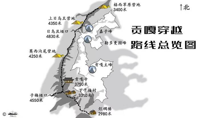 线路总览——贡嘎大环线正穿路线全程约80公里。在5天的徒步里程,分为接近贡嘎、眺望贡嘎群山、仰望贡嘎、凝视贡嘎、告别贡嘎 ——五个阶段。