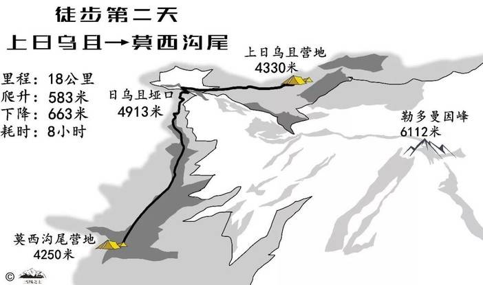 早起后装备早餐,之后拔营出发,开始翻越日乌且垭口。一路上可以欣赏到小贡嘎、嘉子峰以及日乌且冰川风光。垭口海拔约4830米,需要一定体力和耐力去完成,体力不支者可在日乌且牧场雇佣马匹骑马上山(仅限夏及秋季)。日乌且垭口是日乌且沟和莫溪沟的分水岭,垭口气象万千,可以看到贡嘎中部和南部的群山。垭口之后就是一路下山了,比较好走,傍晚在莫溪沟尾扎营。