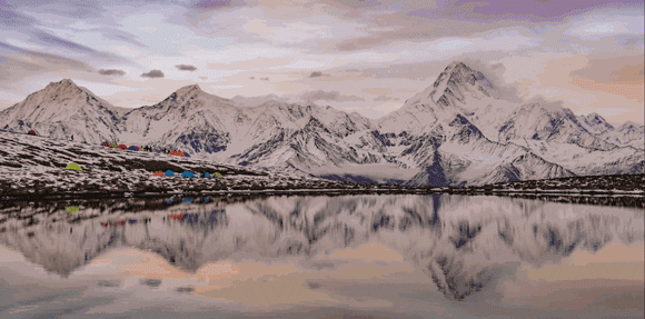 冷嘎措,是贡嘎山南下一滴遗世的眼泪,贡嘎最近的拍摄点之一,在这看贡嘎雄伟的一面,也可以凝望水中倒影梦幻的一面。