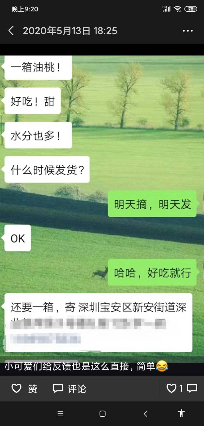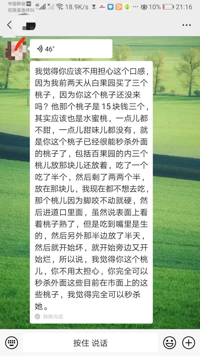价格比超市便宜很多(超市卖的需要打保鲜药,这个不用打药)。桃味鲜美,尤其是在冰箱放一阵的。想买的自己扫描二维码找她咨询,然后在直接在本页面下单。