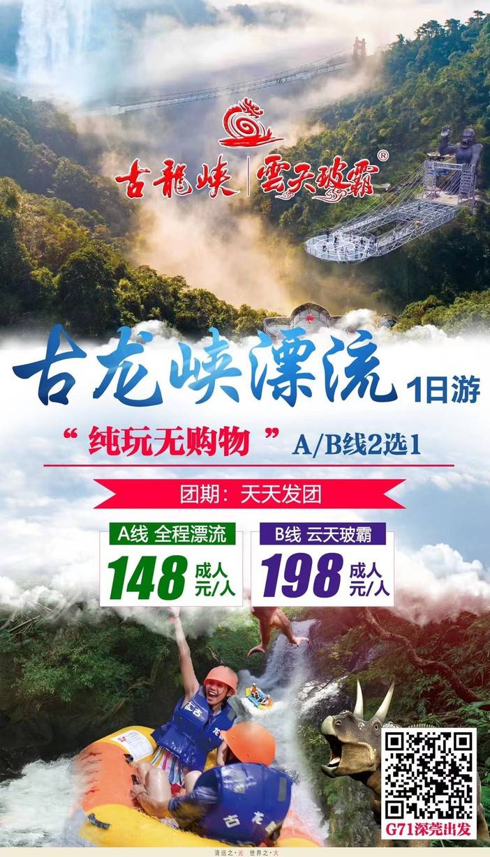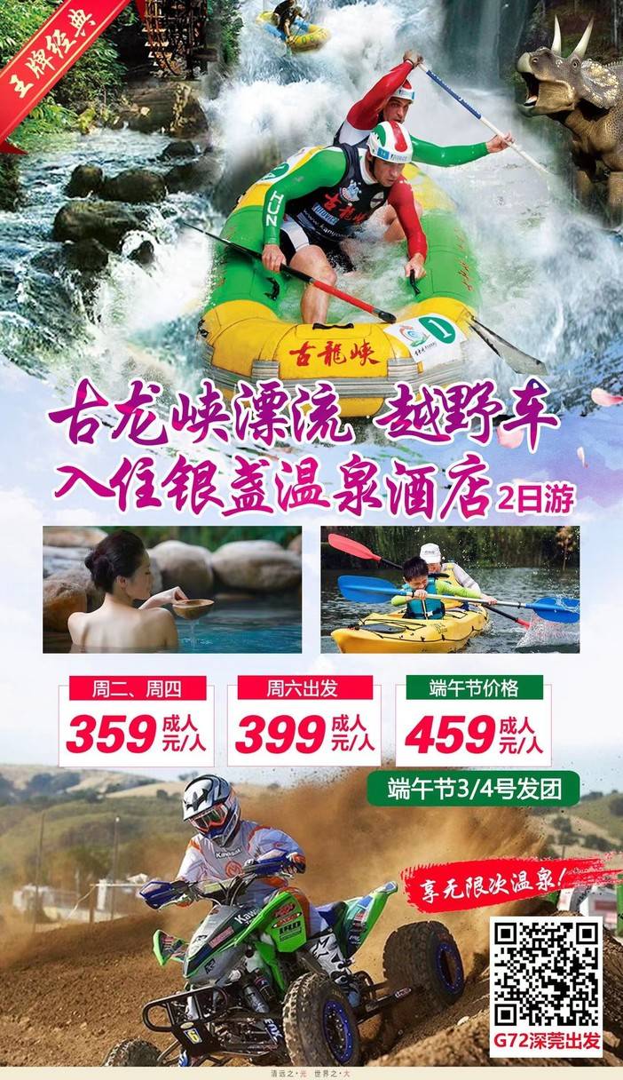 清远浪尖上的过山车古龙峡漂流+越野车,住温泉酒店两日游,周二四出发359,周六出发399,端午节只要459。欢迎公司包团 咨询 15818758951